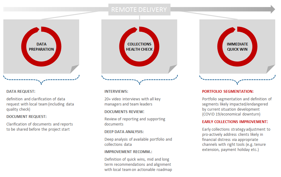 Banks need to adjust the collections to the new situation. The collection processes need to be reviewed and adjusted. At the beginning, segmentation and pro-active measures for high-risk segments needs to be taken, further on, all collection processes need to be fine-tuned.